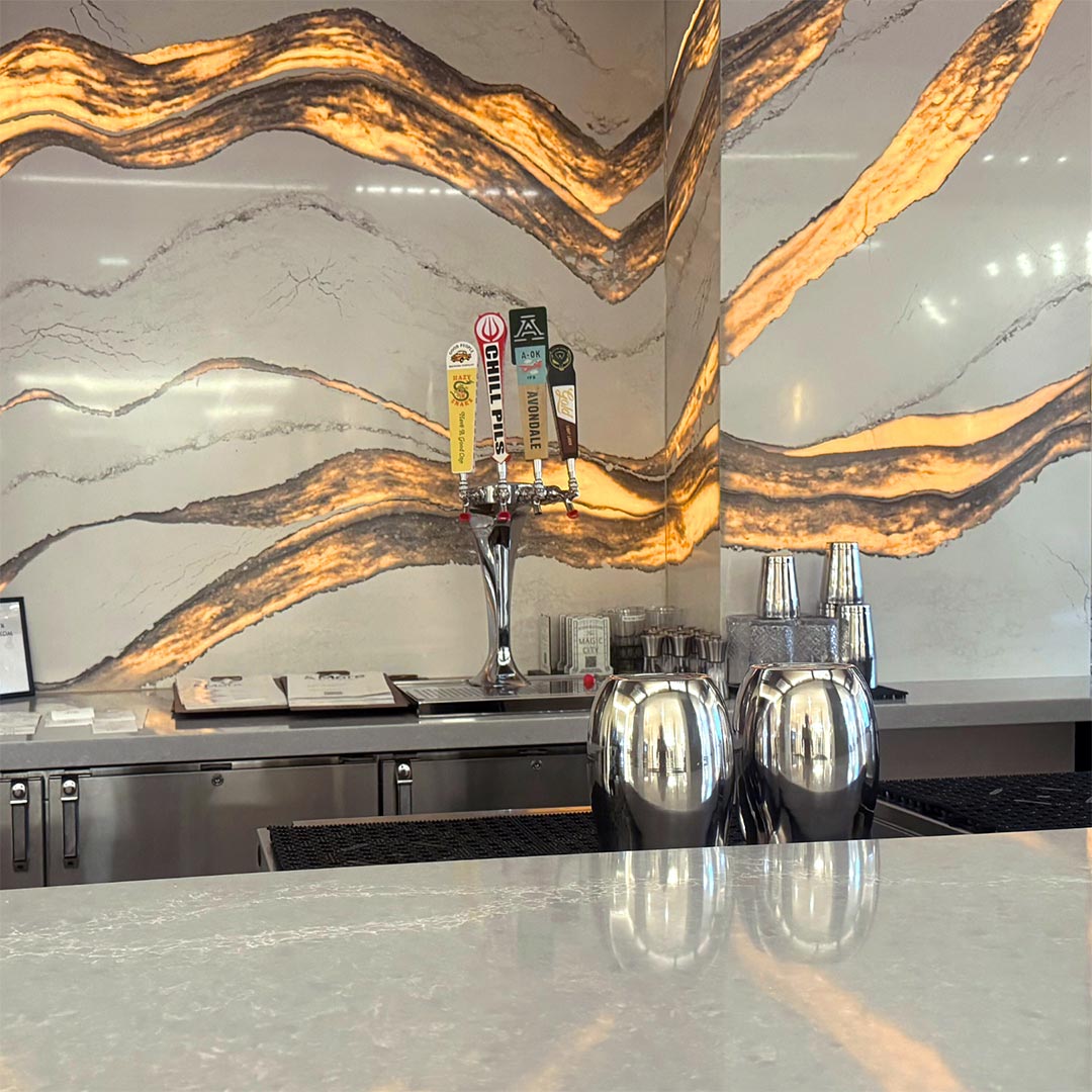 Surface One uses state of the art equipment including laser templates, water jets and robotic machines to fabricate custom shapes, curves and edge profiles. With our Vein Match technology we are able to show our clients what the material will look like in their home before we cut the stone, including seam location and veining alignment. We are also highly experienced with miter joints and miter lamination for seamless edge profiles and waterfall panels.